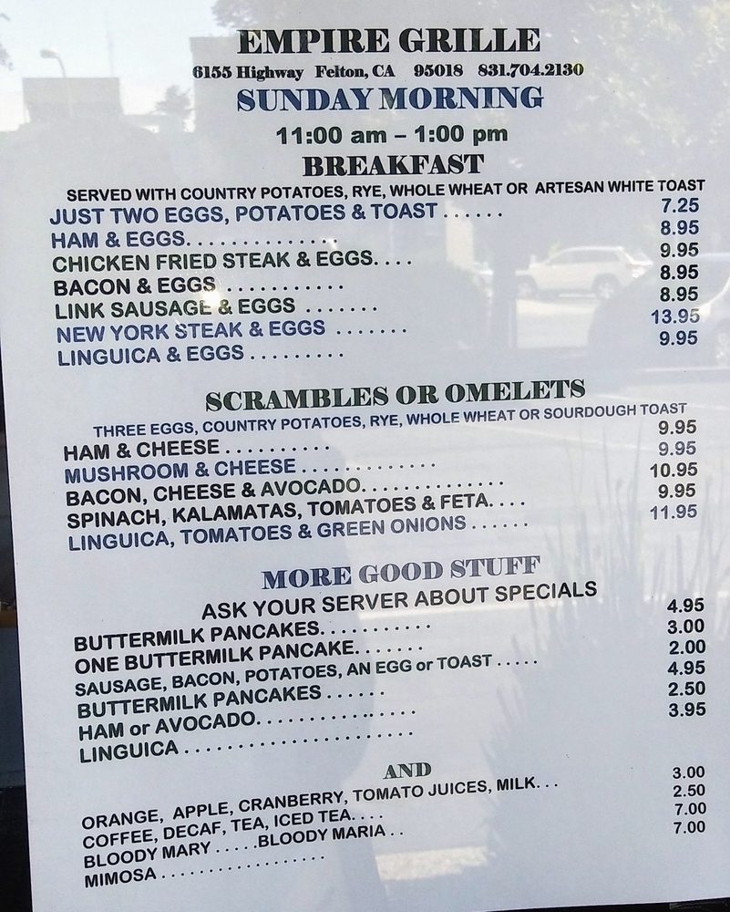 Introducing the menu at Empire Grille, a cozy American bar located in Felton, CA, offers a delightful culinary experience for both locals and visitors. Known for its friendly atmosphere, Empire Grille serves an impressive selection of hearty comfort foods designed to satisfy diverse palates.
